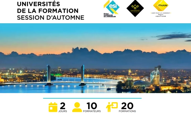 Depuis 2018, la Région FNAIM Aquitaine et ses délégués formation organisent chaque année les Universités de la Formation. Les participants se voient proposer des formations organisées par thématiques (gérance locative, copropriété, etc.) et animées par une dizaine de formateurs.