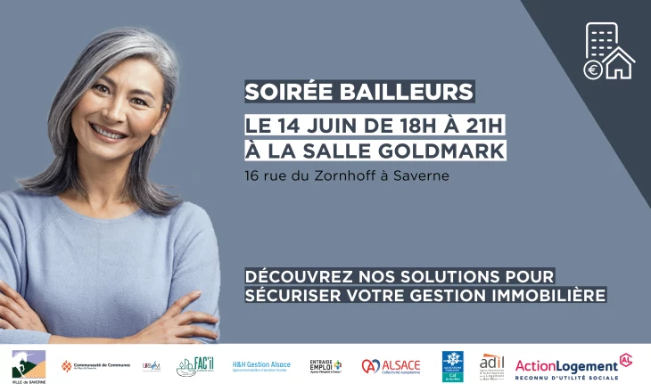 L'Agence Départementale pour l'Information au Logement (ADIL 67), la Caisse d'Allocations Familiales (CAF 67), la Collectivité Européenne d’Alsace (CeA), la Communauté de Communes du Pays de Saverne, l’association Entraide Emploi, la plateforme FAC’il, Habitat & Humanisme Gestion Alsace (AIVS), Soliha Alsace, Urbam Conseil, la Ville de Saverne et Action Logement Services Grand Est ont le plaisir de vous accueillir à leur soirée d'information le mardi 14 juin 2022.