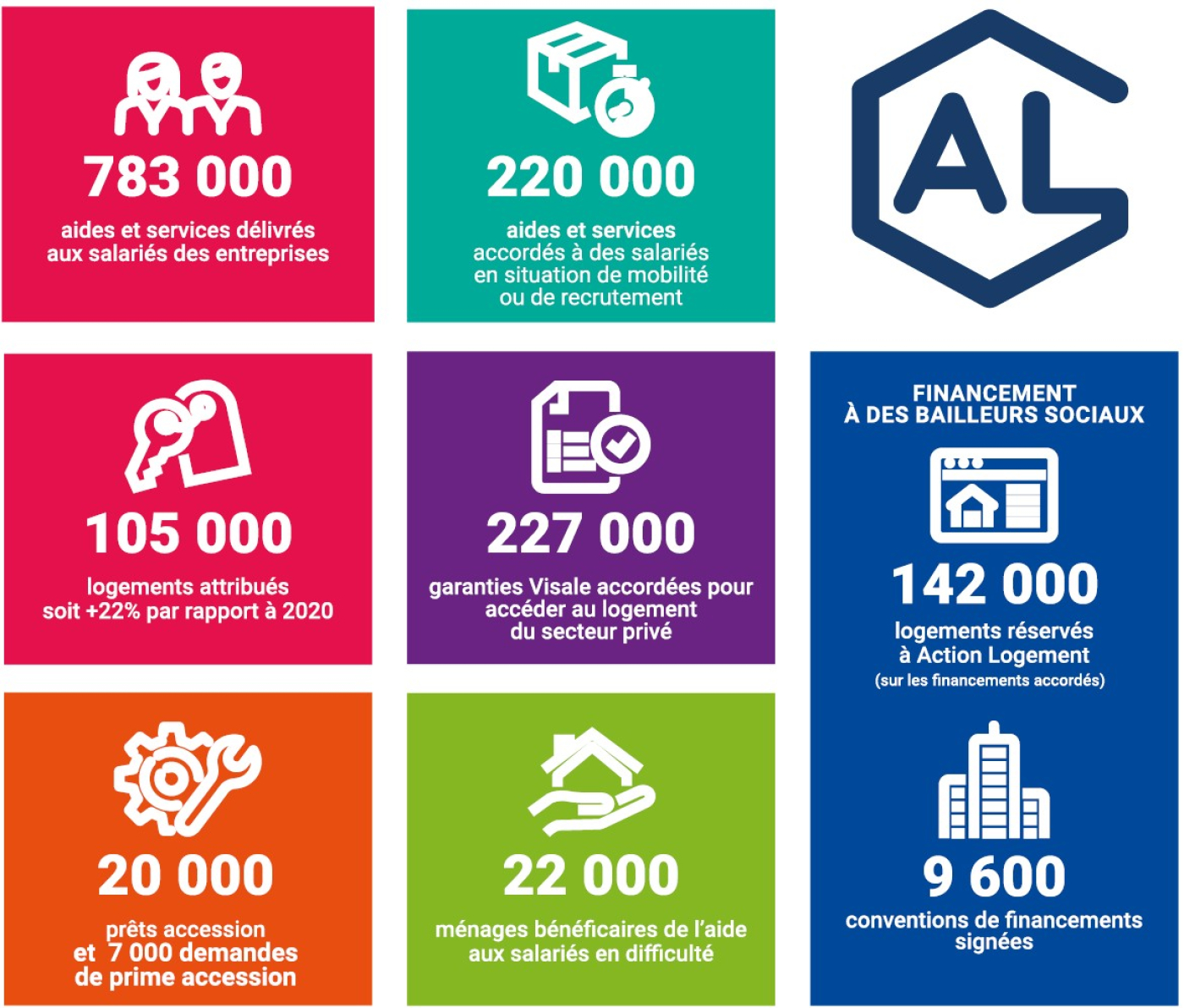 - L’attribution de 105 000 logements (+22% par rapport à 2020), grâce notamment à la plateforme AL’in.fr,