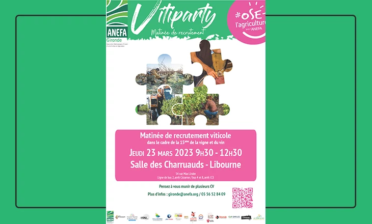 Dans le cadre de la quinzaine des métiers de la vigne et du vin, l’ANEFA organise la 12ème édition de la Matinée de recrutement viticole VITIPARTY consacrée à l’emploi en production viticole. Cet événement a pour but de faciliter la rencontre entre les employeurs viticoles du territoire et des candidats qualifié(e)s ou non en recherche d’emploi en viticulture.