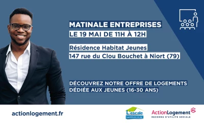 Retrouvez les offres de logements Jeunes d'Action Logement à la matinale entreprise organisée par l'association L’ESCALE, le jeudi 19 mai à 11h.