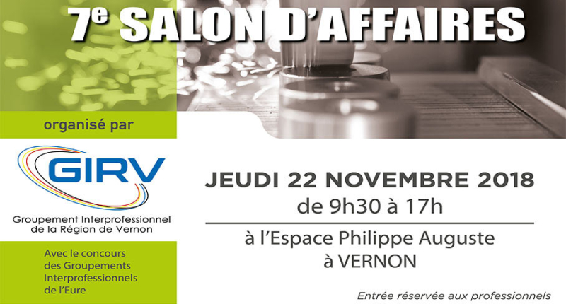 Le jeudi 22 novembre, de 9h30 à 17h, se déroulera la 7ème édition du Salon d’Affaires organisé par le Groupement Interprofessionnel de la Région de Vernon (GIRV), à l’Espace Philippe Auguste à VERNON.